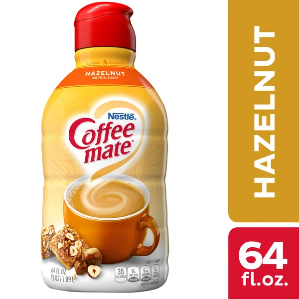 Details: Nestle Coffee mate Hazelnut Liquid Coffee Creamer is the perfect way to create a delicious cup of sweet, nutty perfection. This hazelnut coffee creamer delivers a warm, classic flavor that transforms every drinking experience. Coffee mate hazelnut creamer is a cholesterol-free, lactose-free and non dairy creamer. Coffee mate liquid creamer makes it easy to add the right amount of flavor every time; just pour and stir. Flavored coffee creamer lets you transform your coffee into flavorful deliciousness, whether it's your morning cup or afternoon pick-me-up. The smooth, sweet hazelnut taste is the perfect way to wake up your coffee. Coffee mate coffee creamer comes in a convenient bottle with a snap lid to allow for easy pouring and storage. Store coffee creamer in the refrigerator.