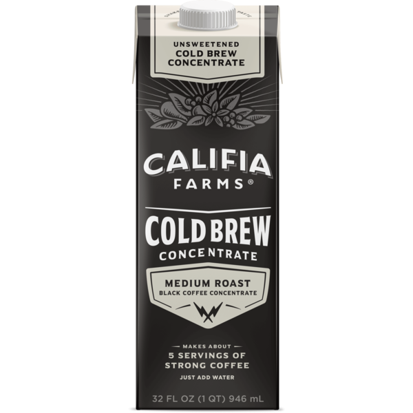 Details: Califia Farms Medium Roast Cold Brew Coffee Concentrate is brewed to blend and ready when you are, so you can customize your cup to your own taste. Mix one-part coffee concentrate with one-part water for a bold pure black coffee, or customize to your taste with Califia plant-based milks and creamers.