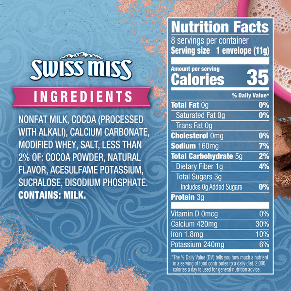 Details: Enjoy each sip of Swiss Miss Milk Chocolate Flavor Reduced Calorie Hot Cocoa Mix. It's the warm, comforting hot cocoa drink that's perfect for mornings, snow days and sweet evening treats. Made with real milk, this Swiss Miss Milk Chocolate Flavor Hot Cocoa has fewer calories than the original for a sensible treat. With 35 calories per serving, this reduced calorie hot drink has no artificial flavors or colors and no preservatives. So, after a long day of work or play, enjoy a moment of milk chocolatey relaxation. Whatever you're warming up to, know that you'll find delights in every mug of Swiss Miss Hot Cocoa Mix.