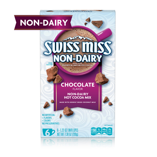 Details: Enjoy each sip of Swiss Miss Non-Dairy Chocolate Flavored Hot Cocoa Mix. It's the warm, comforting hot cocoa drink that's perfect for mornings, snow days and sweet evening treats. Made with nonfat dried coconut milk, this Swiss Miss Non-Dairy Chocolate Flavored Hot Cocoa has the timeless flavor that moms know and kids love. This delicious hot drink has 150 calories per serving. So, after a long day of work or play, enjoy a moment of milk chocolatey relaxation. Whatever you're warming up to, know that you'll find delights in every mug from a Swiss Miss Hot Cocoa Mix.