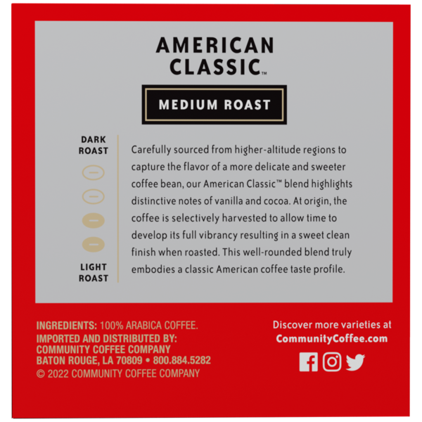 Carefully sourced from higher-altitude regions to capture the flavor of a more delicate and sweeter coffee bean, our American Classic™ blend highlights distinctive notes of vanilla and cocoa. At origin, the coffee is selectively harvested to allow time to develop its full vibrancy resulting in a sweet clean finish when roasted. This well-rounded blend truly embodies a classic American coffee taste profile.