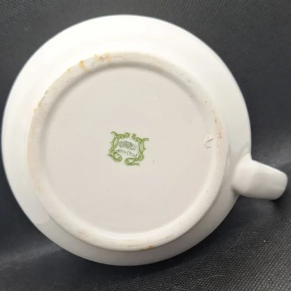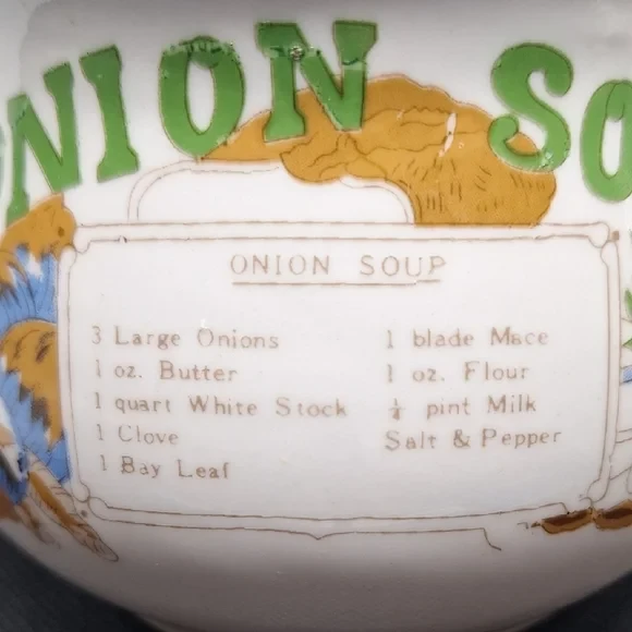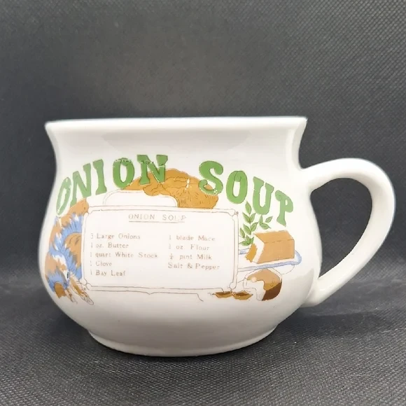 Enjoy your favorite soup in this charming vintage mug featuring an onion soup recipe. The white ceramic mug is adorned with green lettering and delightful illustrations, perfect for adding a touch of nostalgia to your dining experience.