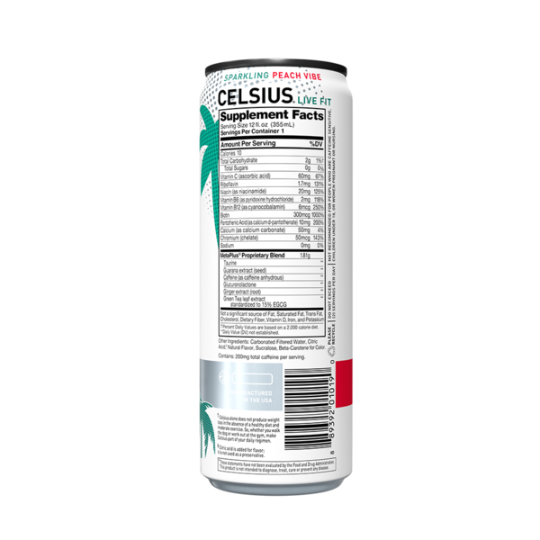 Details: Enjoy nothing but good vibes with CELSIUS Peach Vibe! Peach Vibe is deliciously sweet and 100% refreshing. Made with clinically proven ingredients, this carbonated flavor of CELSIUS has the perfect balance of flavor and energy that serves as an awesome pick-me-up for active lifestyles.