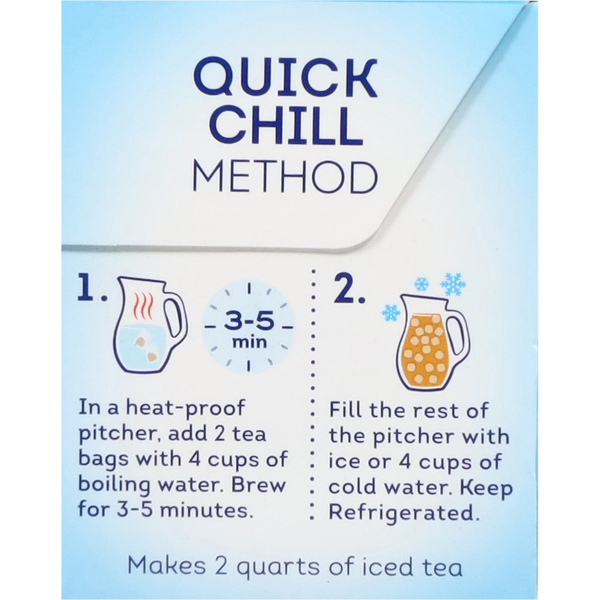 Directions: Quick Chill Method. 1. 3-5 min. In a heat-proof pitcher. add 2 tea bags with 4 cups of boiling water. Brew for 3-5 minutes. 2. Fill the rest of the pitcher with ice or 4 cups of cold water. Keep Refrigerated. Makes 2 quarts of iced tea.