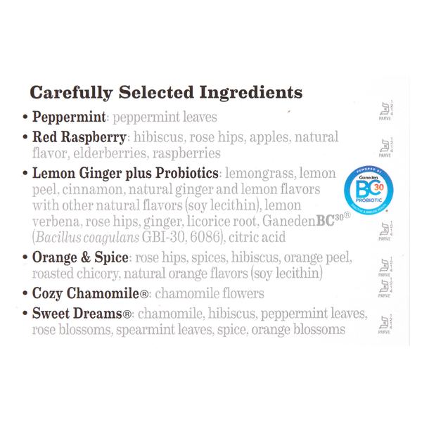 Ingredients: PEPPERMINT: PEPPERMINT LEAVES, RED RASPBERRY: HIBISCUS, ROSE HIPS, APPLES, NATURAL FLAVOR, ELDERBERRIES, RASPBERRIES, LEMON GINGER PLUS PROBIOTICS: LEMONGRASS, LEMON PEEL, CINNAMON, NATURAL GINGER AND LEMON FLAVORS WITH OTHER NATURAL FLAVORS (SOY LECITHIN), LEMON VERBENA, ROSE HIPS, GINGER, LICORICE ROOT, GANEDENBC³⁰ (BACILLUS COAGULANS GBI-30, 6086), CITRIC ACID, ORANGE & SPICE: ROSE HIPS, SPICES, HIBISCUS, ORANGE PEEL, ROASTED CHICORY, NATURAL ORANGE FLAVORS (SOY LECITHIN), COZY CHAMOMILE: CHAMOMILE FLOWERS, SWEET DREAMS: CHAMOMILE, HIBISCUS, PEPPERMINT LEAVES, ROSE BLOSSOMS, SPEARMINT LEAVES, SPICE, ORANGE BLOSSOMS