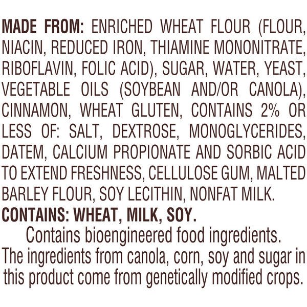 Ingredients: ENRICHED WHEAT FLOUR (FLOUR, NIACIN, REDUCED IRON, THIAMINE MONONITRATE, RIBOFLAVIN, FOLIC ACID), SUGAR, WATER, YEAST, VEGETABLE OILS (SOYBEAN AND/OR CANOLA), CINNAMON, WHEAT GLUTEN, CONTAINS 2% OR LESS OF: SALT, DEXTROSE, MONOGLYCERIDES, DATEM, CALCIUM PROPIONATE AND SORBIC ACID TO EXTEND FRESHNESS, CELLULOSE GUM, MALTED BARLEY FLOUR, SOY LECITHIN, NONFAT MILK