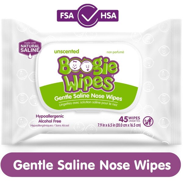 Details: GENTLE SALINE WIPES FOR STUFFY NOSES®: Boogie Wipes® saline nose wipes are wet wipes made with natural saline, which is gentle on skin, helps clean and dissolve snot and boogers, and wipes away dirt and germs. They’re gentle enough to be used on noses, faces, fingers and toes whenever cleaning is necessary.