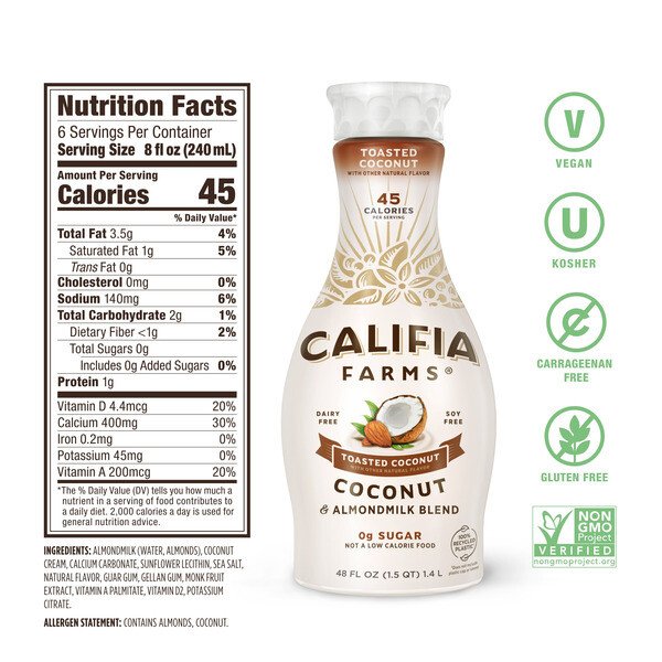 Like all of our plant milks, we make our Toasted Coconut Almondmilk using only simple, non-GMO-certified plant-based ingredients, with no soy, gluten or carrageenan. Every serving is an excellent source of calcium; each cup contains 30% of the recommended daily value.