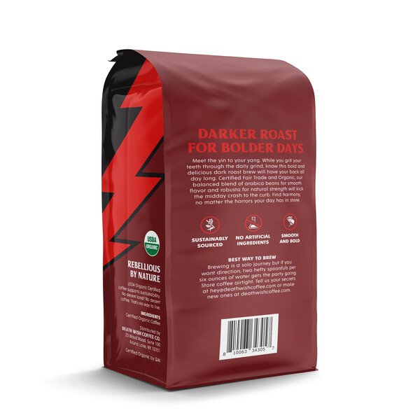 Details: Dark roast. Bold flavor. Reliable. Doesn’t ask questions. Our original dark roast is sourced from the highest- quality, Fair Trade and USDA Certified Organic coffee beans in the world and roasted in the USA. With notes of dark chocolate and black cherry, Death Wish Coffee Dark Roast serves up a strong cup every time, getting you the caffeine you need without ever tasting bitter or acidic. This is 10 ounces of power to fuel even your busiest days.