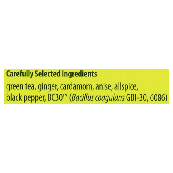 Ingredients: GREEN TEA, GINGER, CARDAMOM, ANISE, ALLSPICE, BLACK PEPPER, BC30™ (BACILLUS COAGULANS GBI-30, 6086)