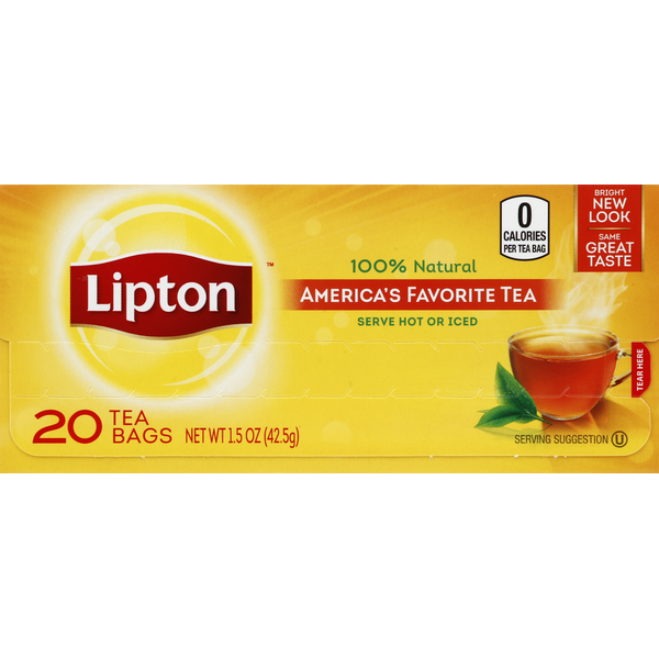 Details: 100% natural. America's favorite tea. Serve hot or iced. 0 calories per tea bag. Bright new look. Same great taste. Stay fresh pack for a great taste & aroma. With freshly pressed leaves. To learn more about tea's role in a healthy lifestyle call 1-888-LiptonT (1-888-547-8668) or visit www.lipton.com. Caffeine - 55 mg per 8 fl oz serving. Theanine - 10 mg per 8 fl oz serving. Find our recipes on yummly.com/Lipton. Our master blenders have crafted this delicious blend that includes carefully selected and fresh-pressed tea leaves, capturing as much natural tea taste and aroma as possible. It's the Lipton difference - so take a sip and let our tea brighten your day. Quality and taste since 1890. It all started with one bright idea, from Sir Thomas Lipton. Our founder was a man on a mission - to share his passion for tea around the world. He believed that everyone deserved high-quality, great-tasting tea. And over 120 years later, that belief is still what drives us - inspiring more flavors, more varieties, and more love than ever for everything tea.